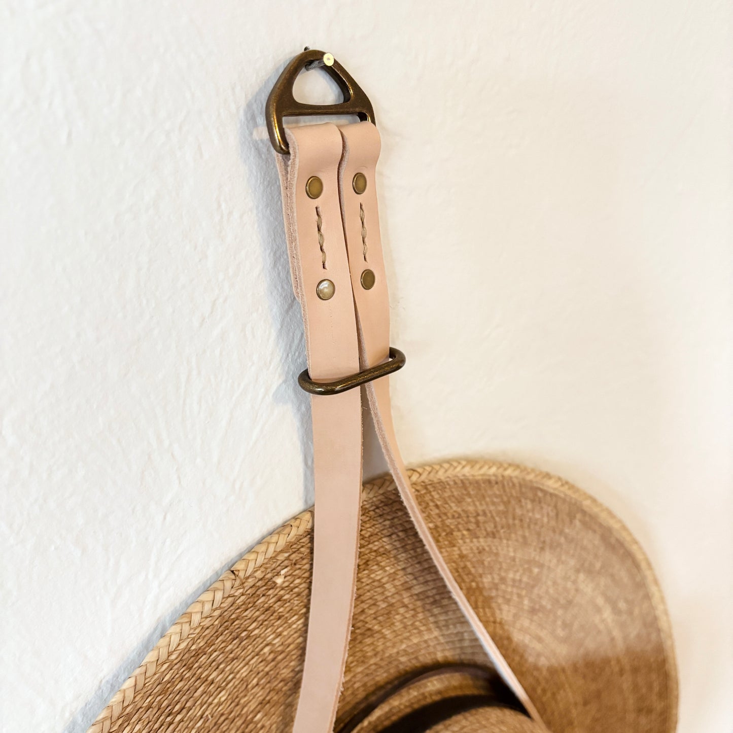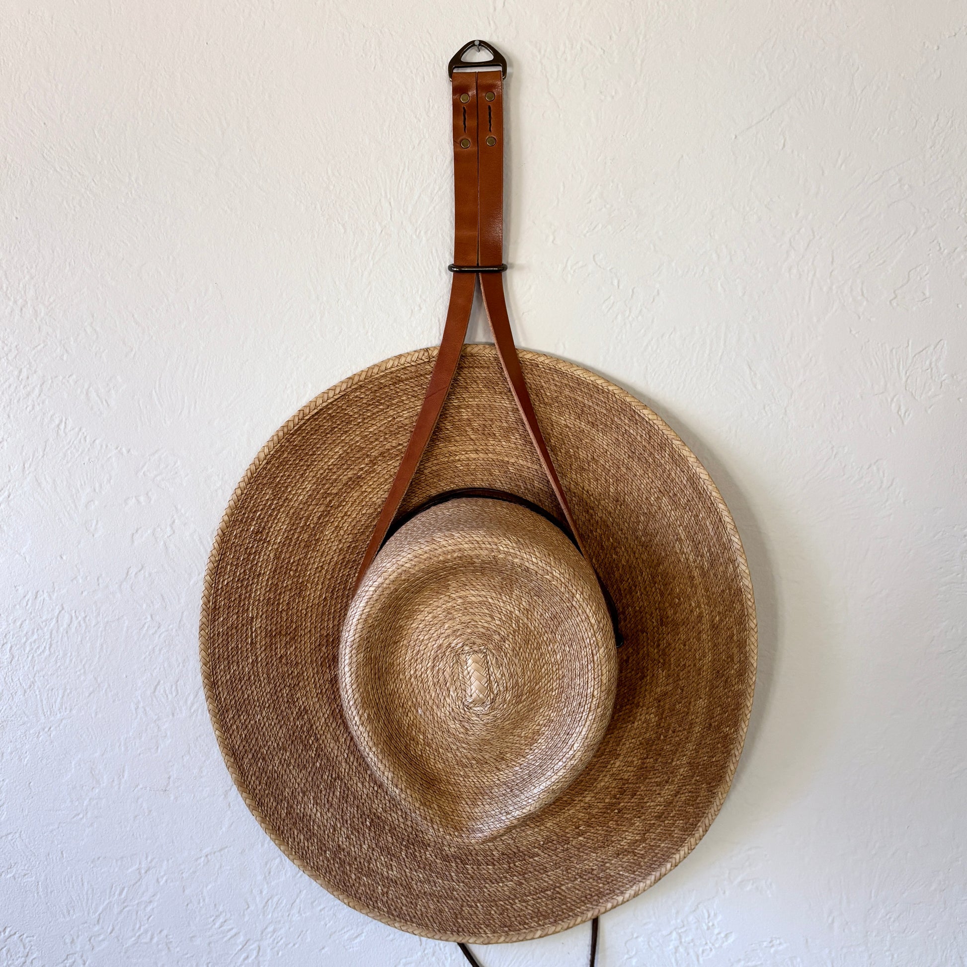 When the end of season arrives and gear becomes art, this Big Hat Hanger will be your perfect accessory. Designed to show off your favorite hat, the adjustable brass slider will allow this hanger to fit any sized flat brim hat. Crafted from premium leather, solid brass hardware, and hand stitched with braided, waxed thread. This Hat Hanger will gain a patina over time, becoming an extension of your everyday. Comes in a stamped cotton bag.