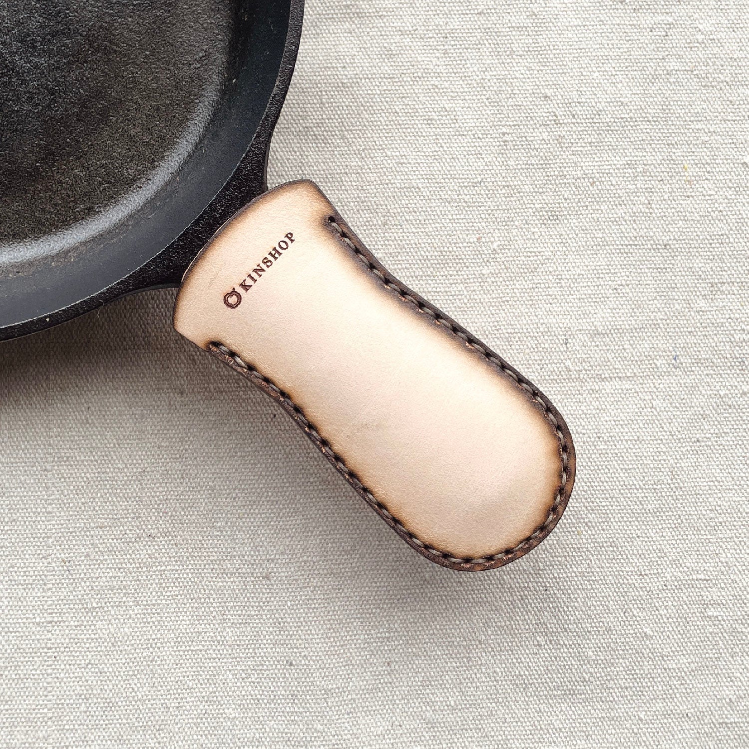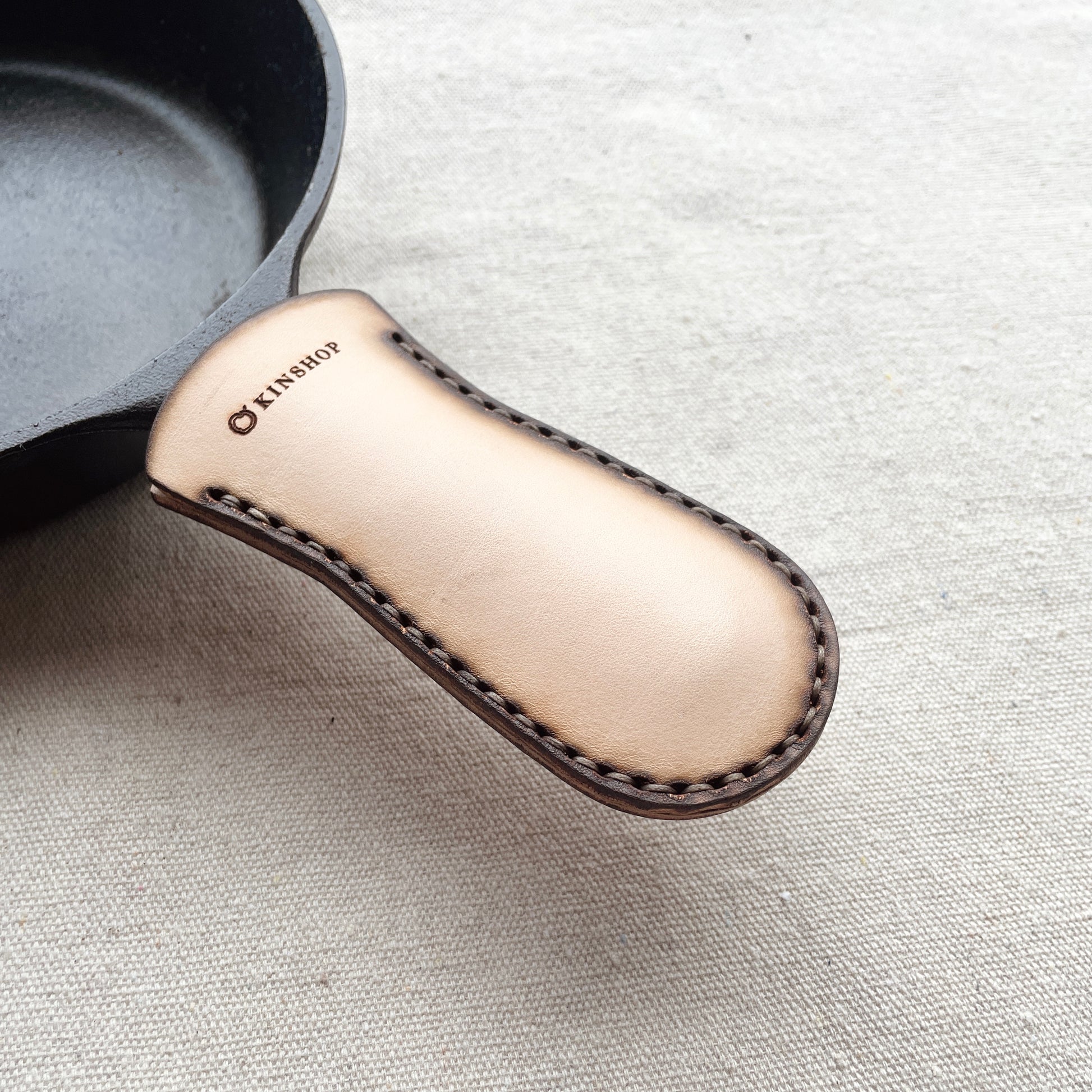 Ready to lend a hand in a hot situation, this Cast Iron Handle Sleeve is the perfect companion in the kitchen. All of the kitchen oils and food bits will only add to the leather, darkening it dramatically with use. Please note, this leather sleeve is meant to be removed from the handle of the hot cast iron pan while over the fire or in the oven, as the leather will burn! Crafted from premium leather and hand stitched with braided, waxed thread. This cast iron handle sleeve will gain a patina over time, becoming an extension of your everyday. Comes in a stamped cotton bag.