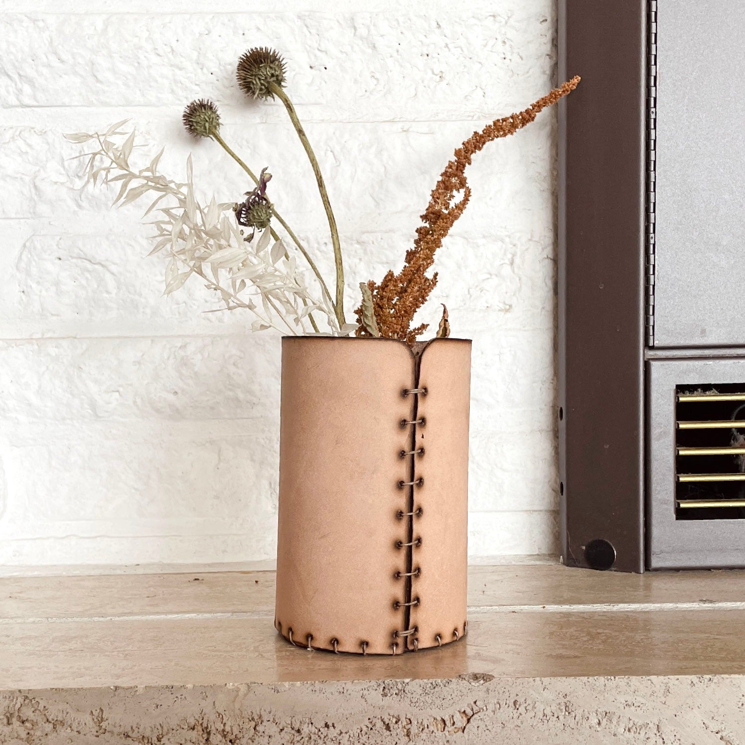 Our all-leather Containers are the perfect addition to any space. Acting as a nice holder for dried flowers, pens and paintbrushes, or wooden kitchen spoons, these Containers are an easy way to incorporate leather into your life. Crafted from premium leather and hand stitched with braided, waxed thread. This container will gain a patina over time, becoming an extension of your everyday. Comes in a stamped cotton bag.
