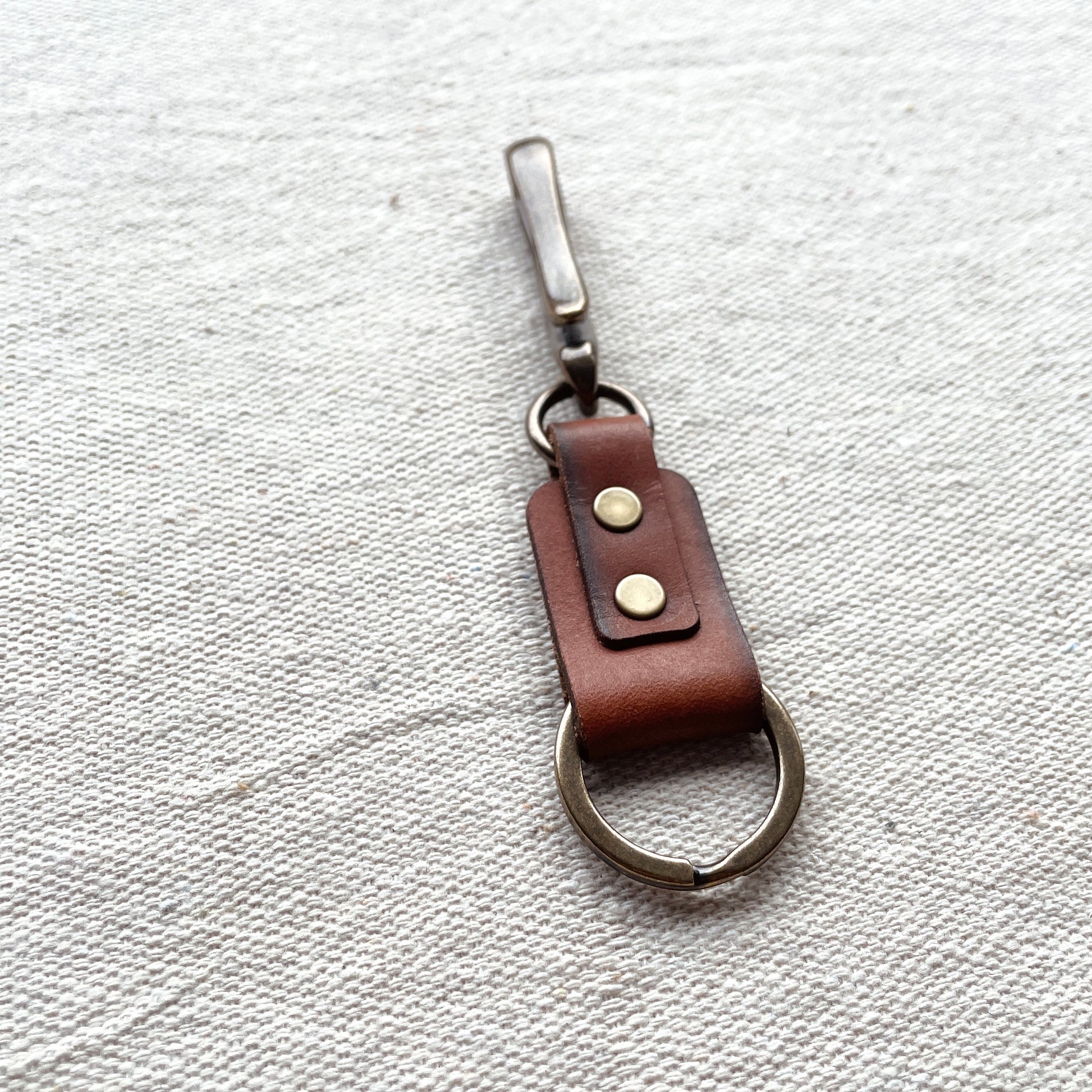 Made for hooking onto your belt loop or the inside pocket of a bag, this Fish Hook Keychain is an easy way to keep track of your keys. Low in profile, but high in detail. These are one of our favorite items that we make that utilize all of the small leftover bits of leather. Crafted from premium leather and solid brass hardware. This Fish Hook Keychain will gain a patina over time, becoming an extension of your everyday. Comes in a stamped cotton bag.
