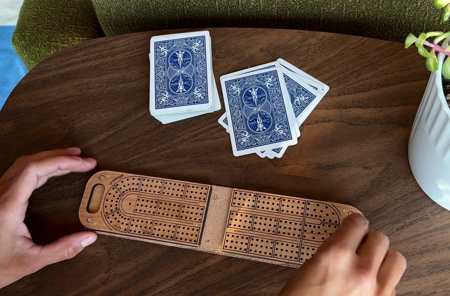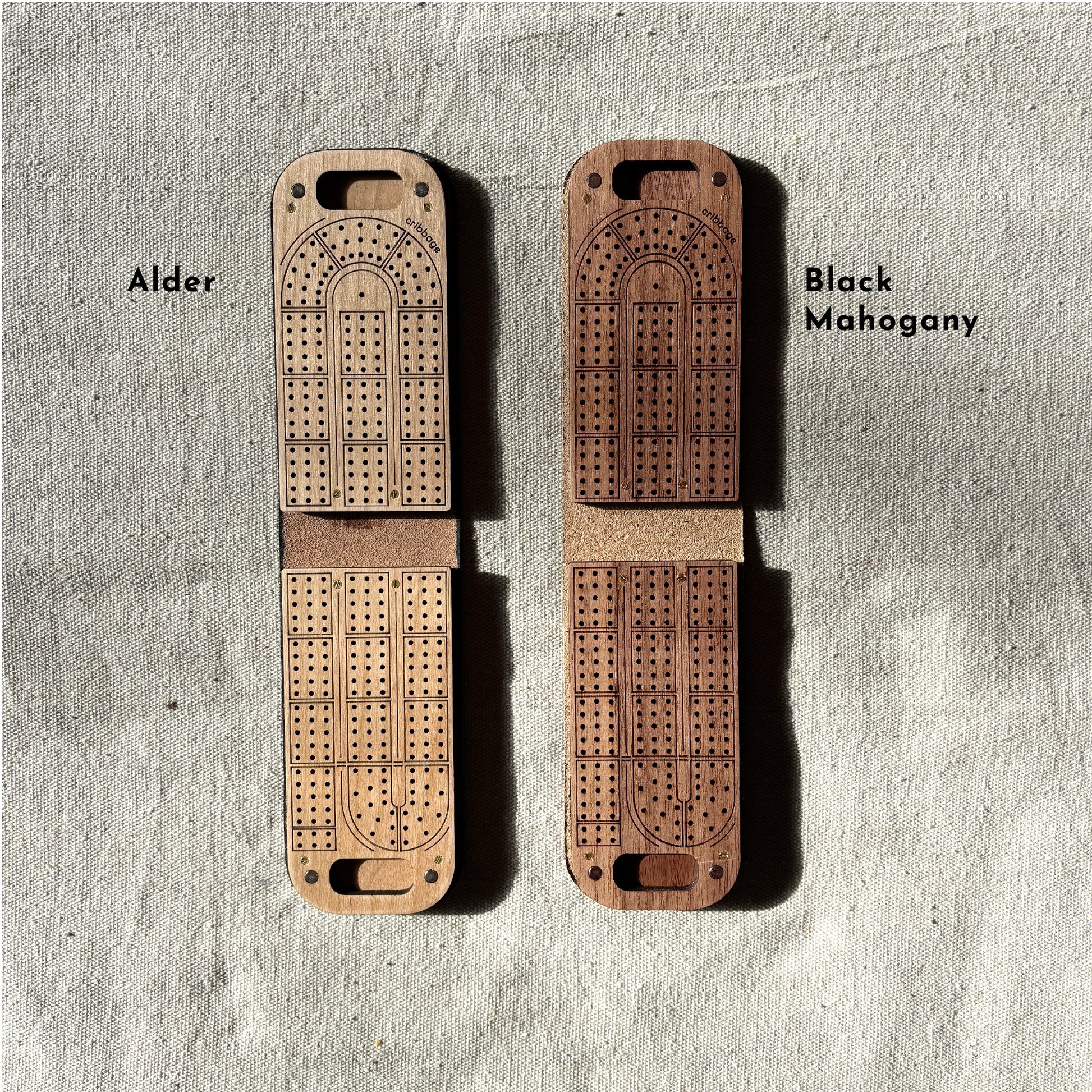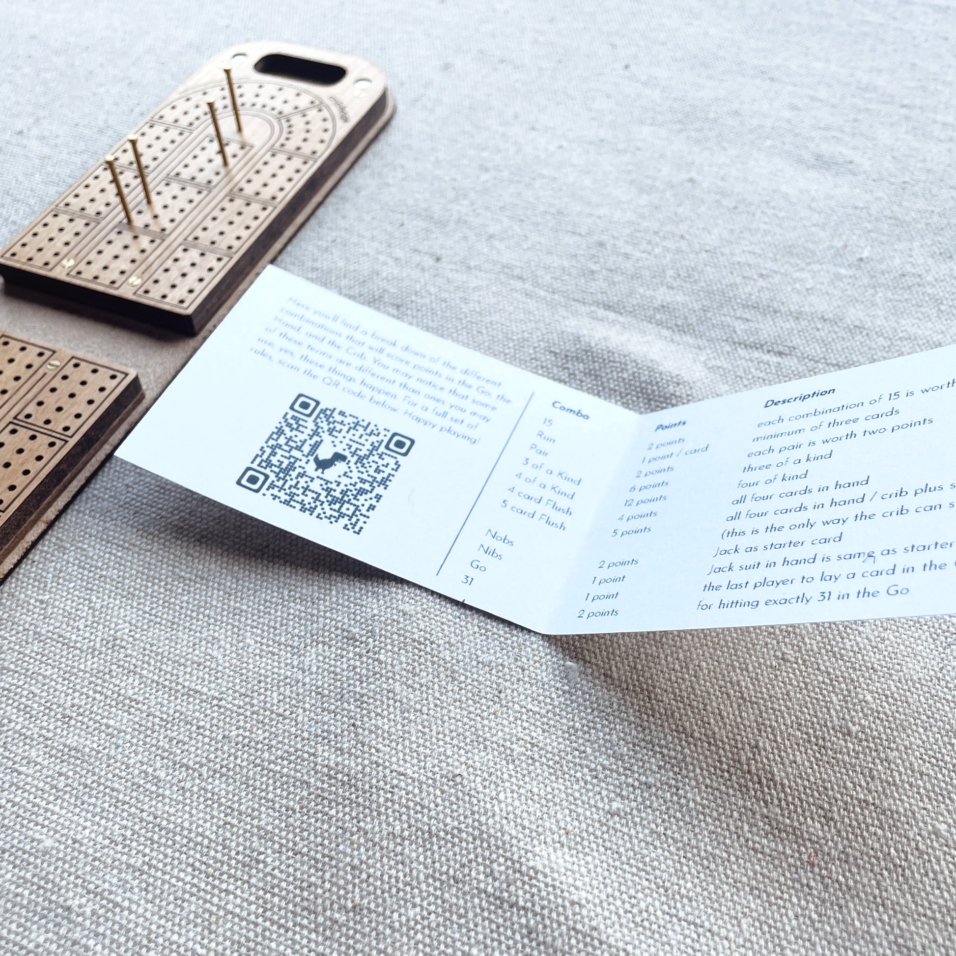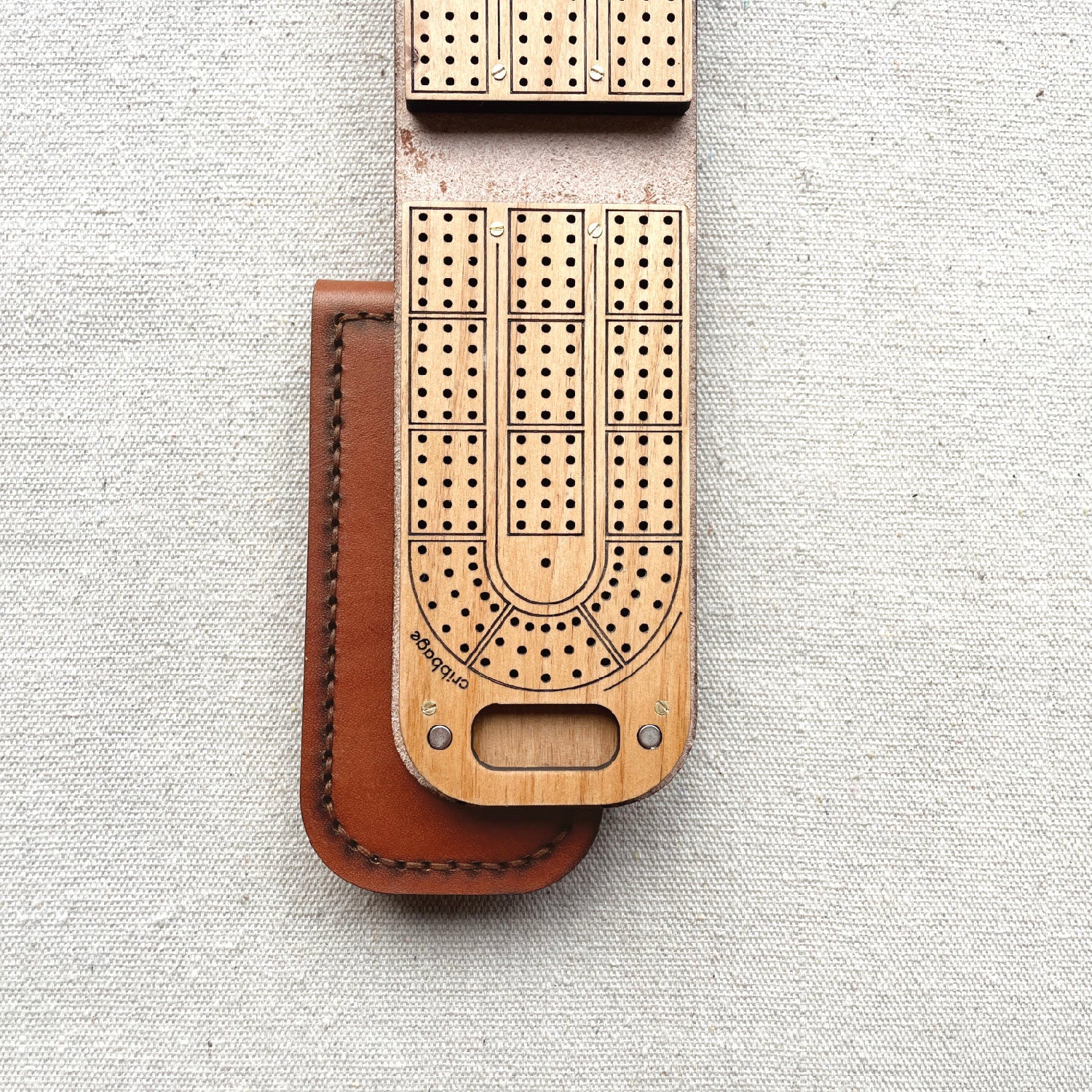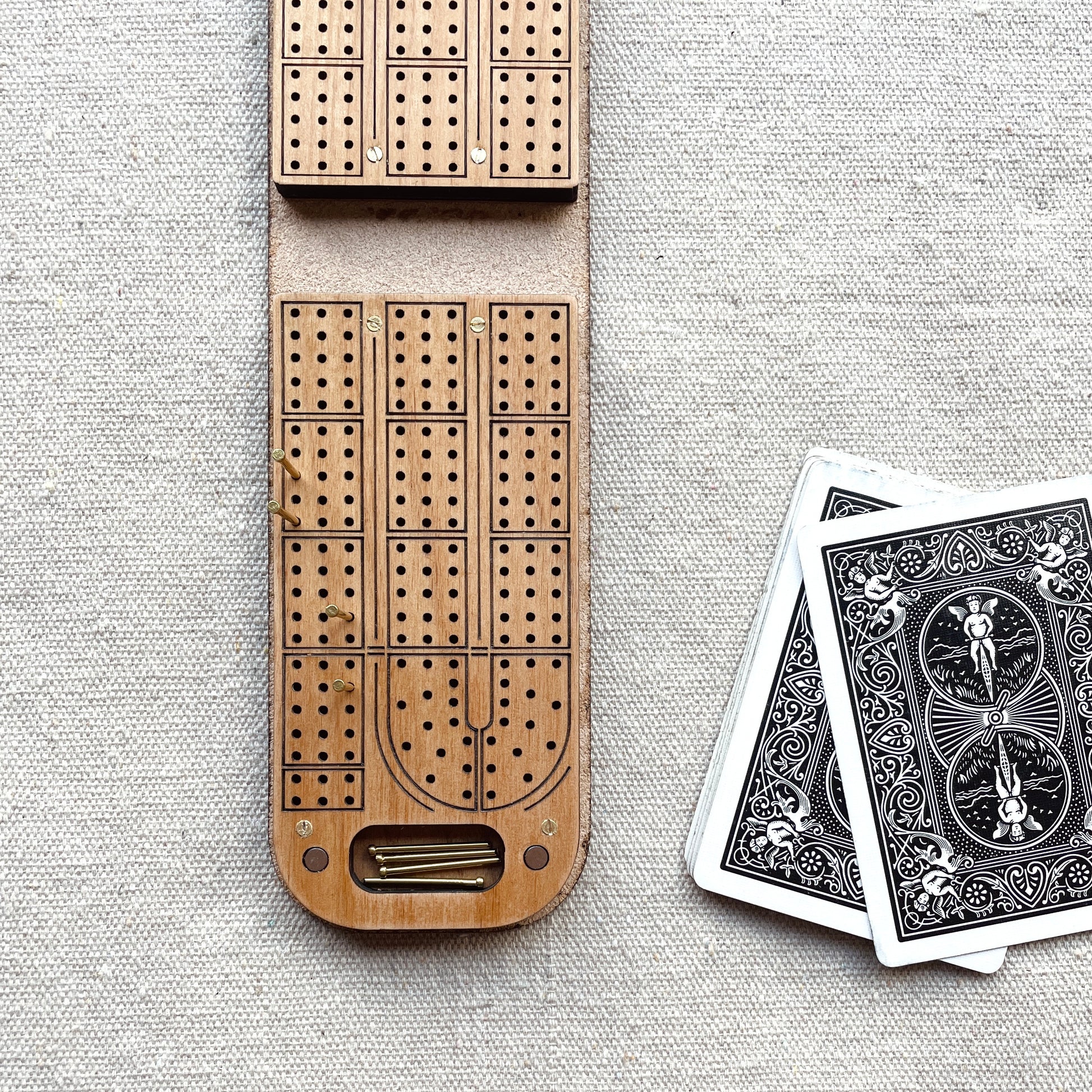 A travel-friendly cribbage board that allows for three players, has the complete track, and still feels like a quality, heirloom board. Measuring in at perfectly pocket sized, this cribbage board is ready for any adventure. Four strong magnets keep the board firmly closed when not in use. Each cribbage board comes with a card describing the awarded points and a link to the full set of game play rules. Crafted from premium leather, hardwood, and hand stitched with braided, waxed thread. This cribbage board will gain a patina over time, becoming an extension of your everyday. Comes in a stamped cotton bag.