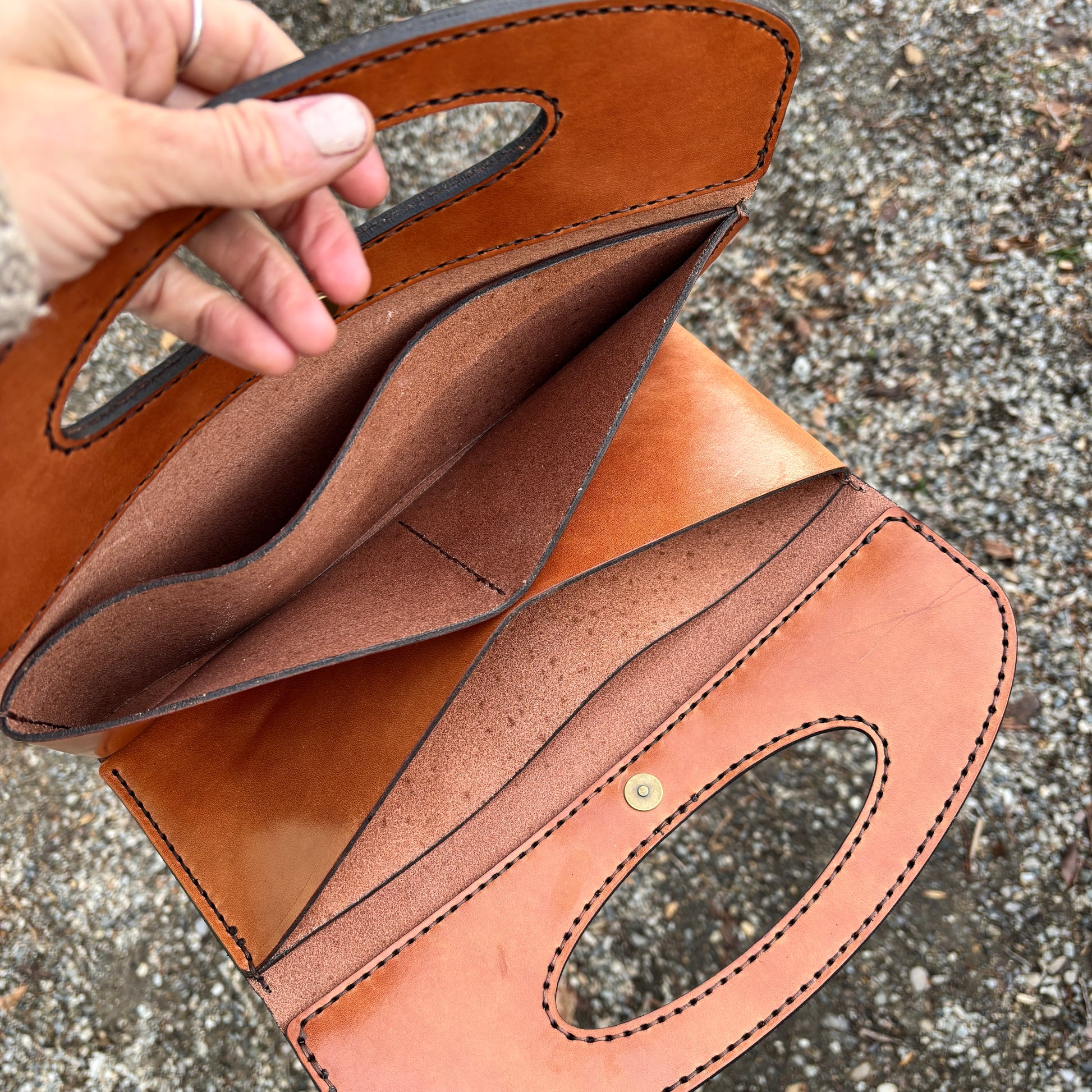 A classic, minimalist clutch that will elevate any outfit. Features four interior pockets for easy organization and a magnetic snap closure. Crafted from premium leather, solid brass hardware, and hand stitched with braided, waxed thread. This bag will gain a patina over time, becoming an extension of your everyday.